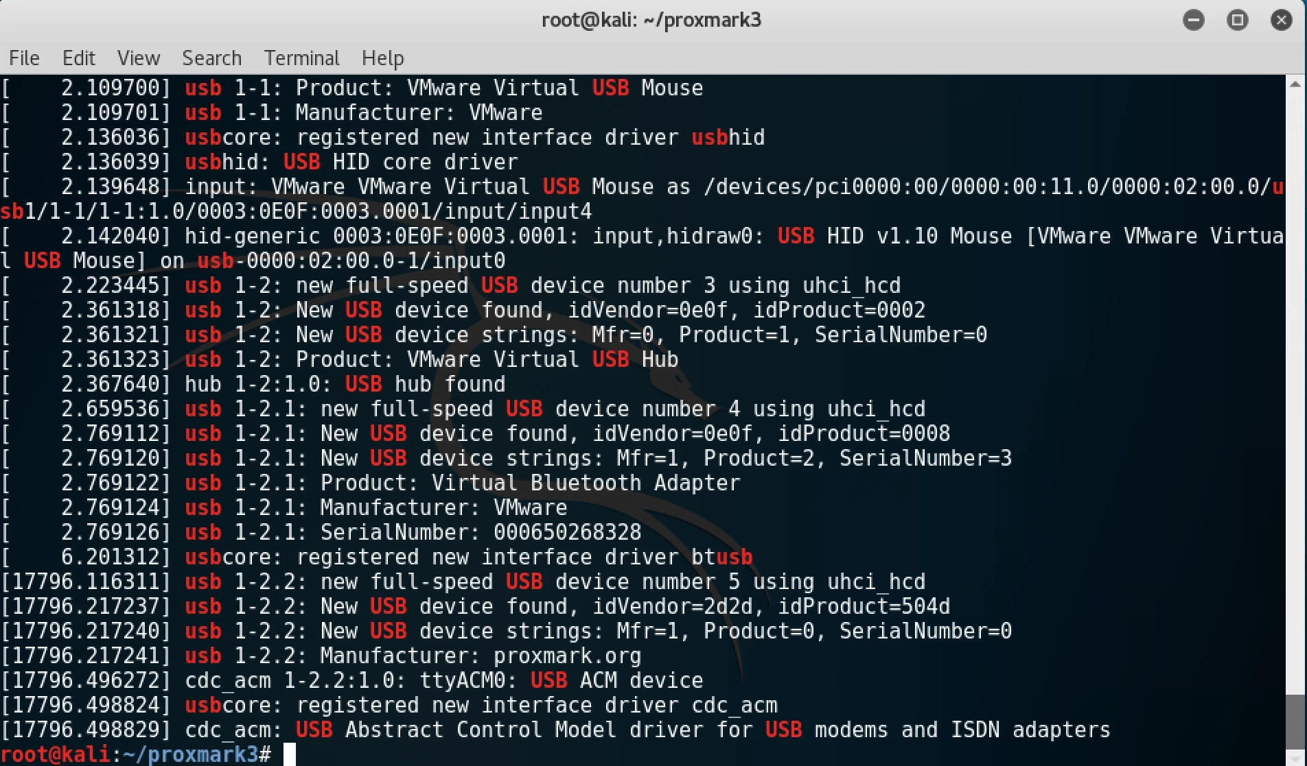 This command will list information about USB devices connected to your system. Look for entries related to the Proxmark3, which is typically identified as a CDC bootloader (cdc_acm) and usually appears as ttyACM0.
